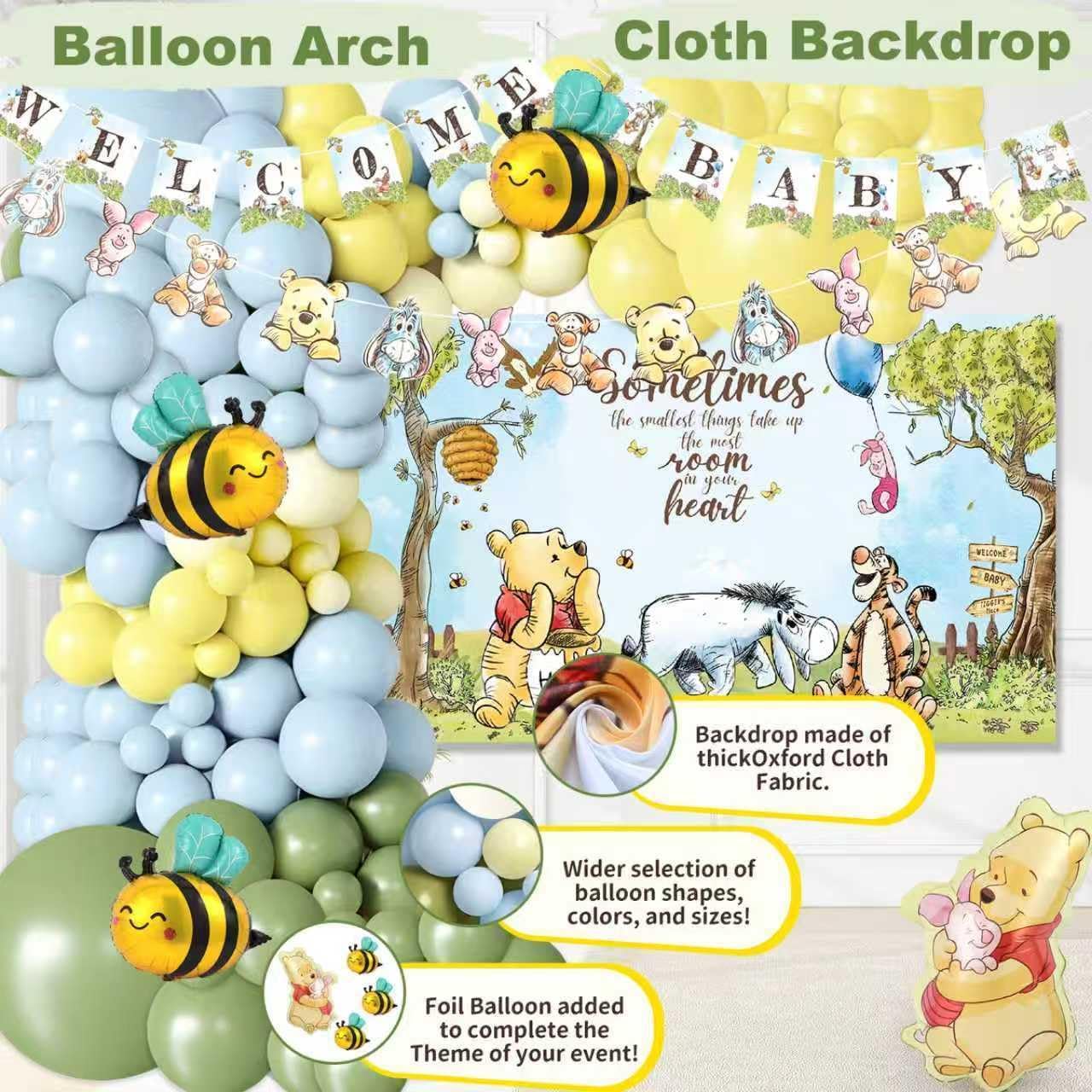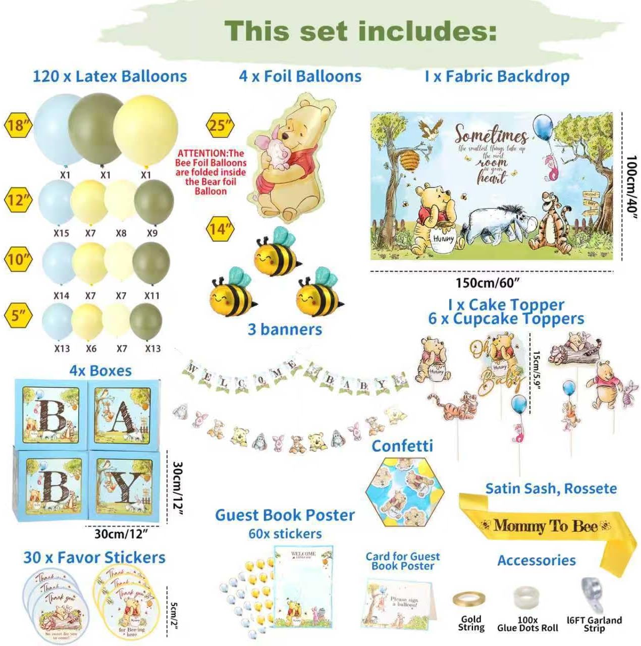 | Included Components | BABY Boxes, Banners, Winnie Garland, Balloon Arch, Cake and Cupcake Toppers, Table Confetti, Guest Book Poster & Card, Favor Stickers, Cloth Backdrop, Latex and Foil Balloons, "Mommy to Bee" Sash |
