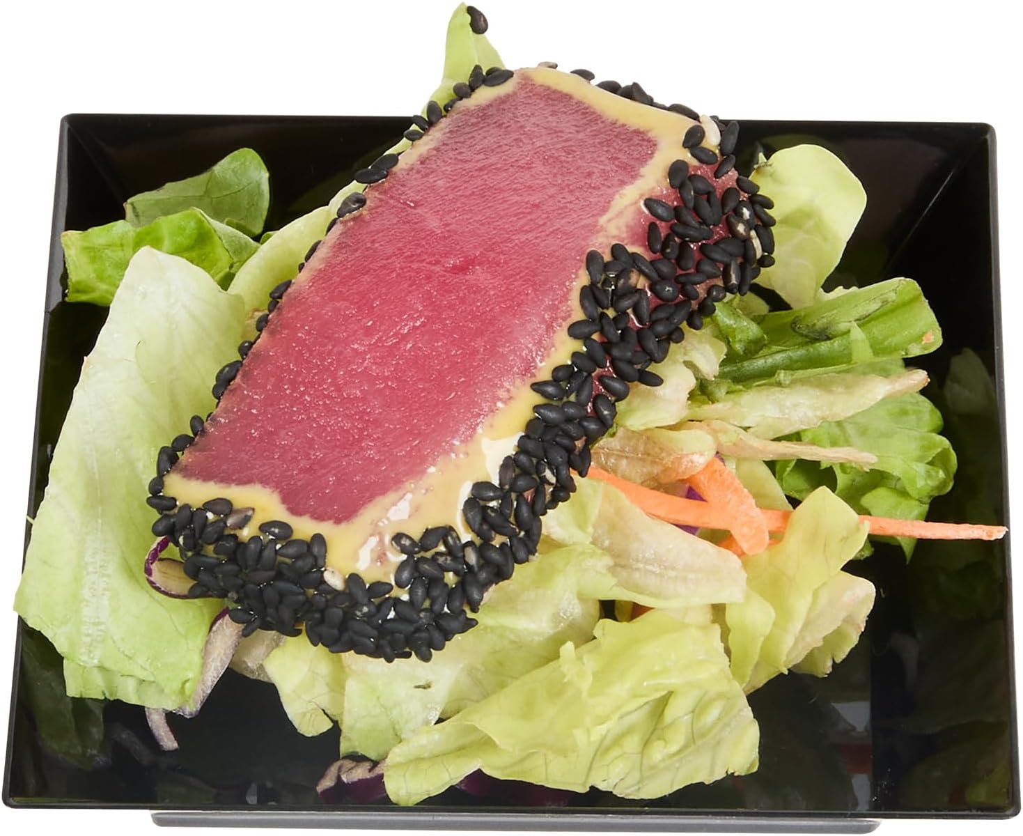 Artfully plate unique appetizers using our Mini Serve Square Black Plastic Small Modern Plates. Perfect for catering events, banquets, or restaurants, these sturdy disposable plates are made from high-quality plastic and are recyclable for an easy and eco-friendly cleanup. Featuring a squared design and glossy black finish, these square appetizer plates add a high-end look to small servings of stuffed dates, canapes, and tarts. The raised edges of these black plastic plates are ideal for mess-free serving. To keep dishes intact and stop spills, these disposable plates are crack-resistant and leak-resistant. These square appetizer plates can be stacked together for easy space-saving storage. Measuring 3.9 inches in length by 3.9 inches in width, these black plastic plates are sold in a 100 count box.