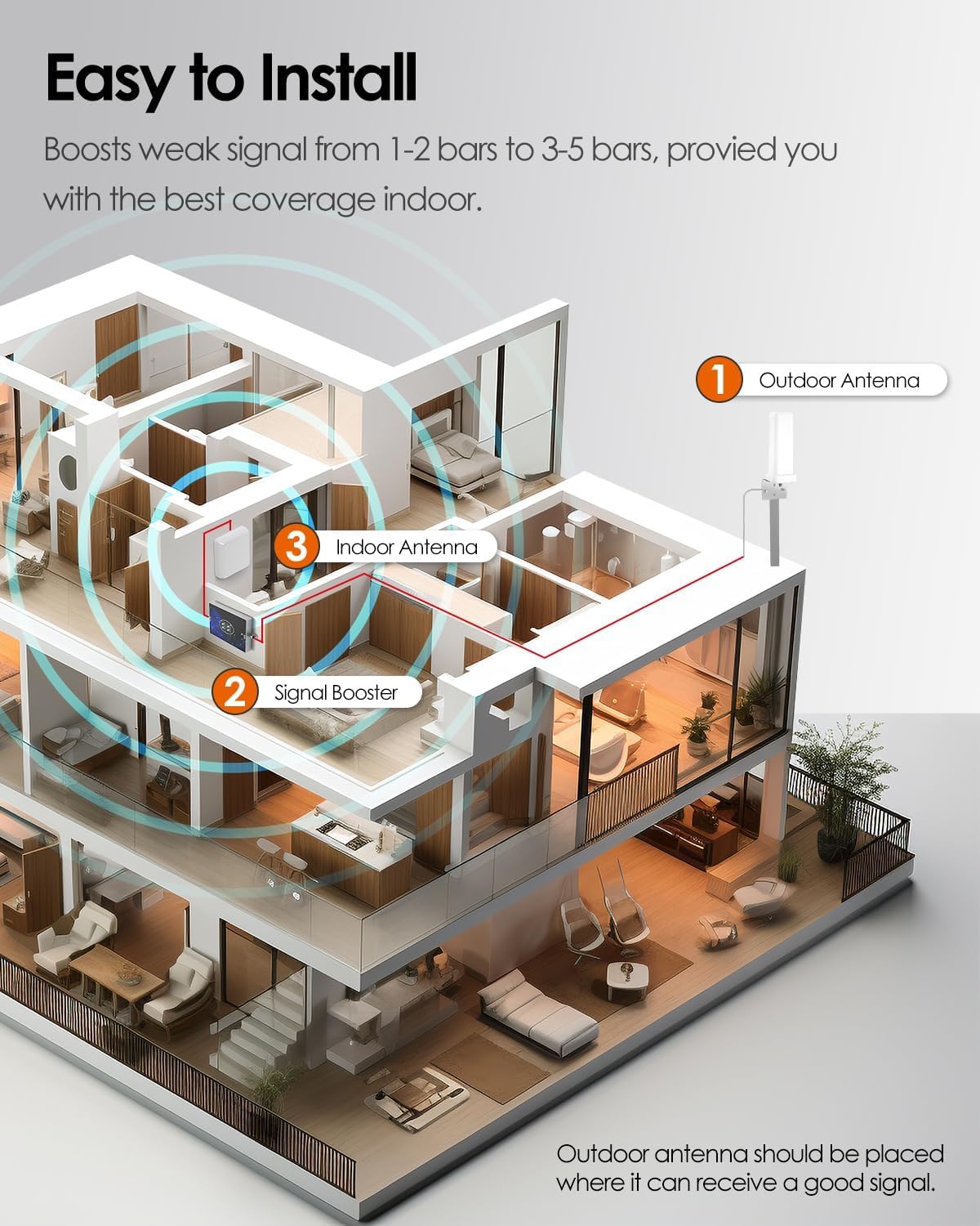 | BuiltIn Media | 360ยฐ Omnidirectional outdoor antenna, 43 ft coax wire, Cell Phone Signal Booster, Panel indoor antenna, Power adapter |