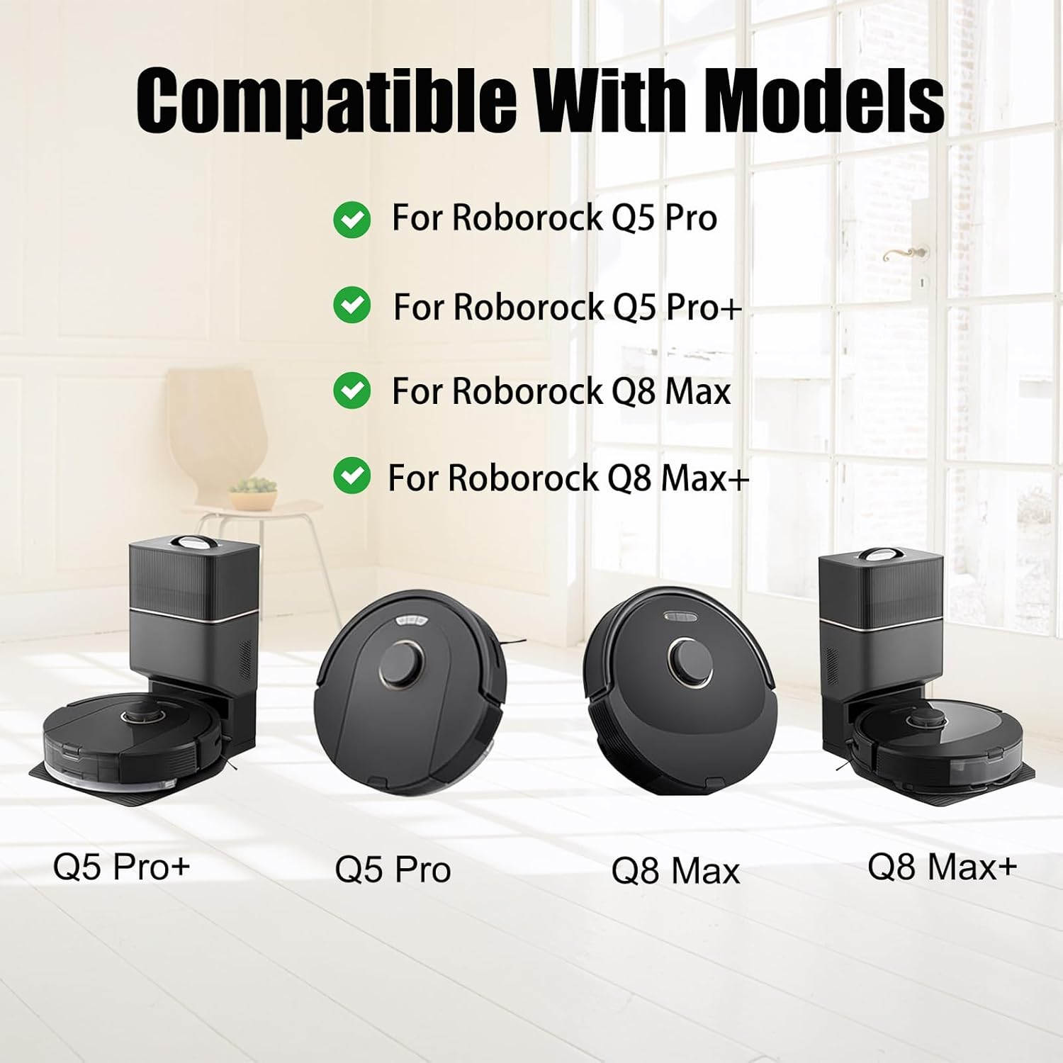 Features: Compatible with: Our accessories are perfect for Roborock Q8 Max/ Q8 Max+ / Q5 Pro+/ Q5 Pro Robot Vacuum Cleaner, please confirm your machine model before purchasing. Up to 99.97% Filtration: HEPA filter is made of premium quality, it can capture 99.97% of dust, debris and other fine particle, preventing them from into the air you breathe. Roller Brush & Side Brush: The rubber main roller brush can easily clean the hair tangled on the brush, perfect for carpet. Side brush can deeply and easily clean the dust and debris from corner and edge. Mop Pad &Dust Bag : Our mop cloth has strong water absorption and cleaning power, easy to remove the stubborn stains on the floor. Dust bag with multi-layer fabric can block 99% of odd smell, keeping your home clean. 17Pcs Accessories kit: It is recommended to replace these replacement every 3-6 months for high-efficiency performance, depending on your using frequency. Package includes: 2 Roller Brush 4 Mop Pads 4 Filters 6 Side Brush 1 Cleaning Tool Note: 1.Light shooting and different displays may cause the color of the item in the picture a little different from the real thing. 2.The measurement allowed error is +/- 1-3cm.