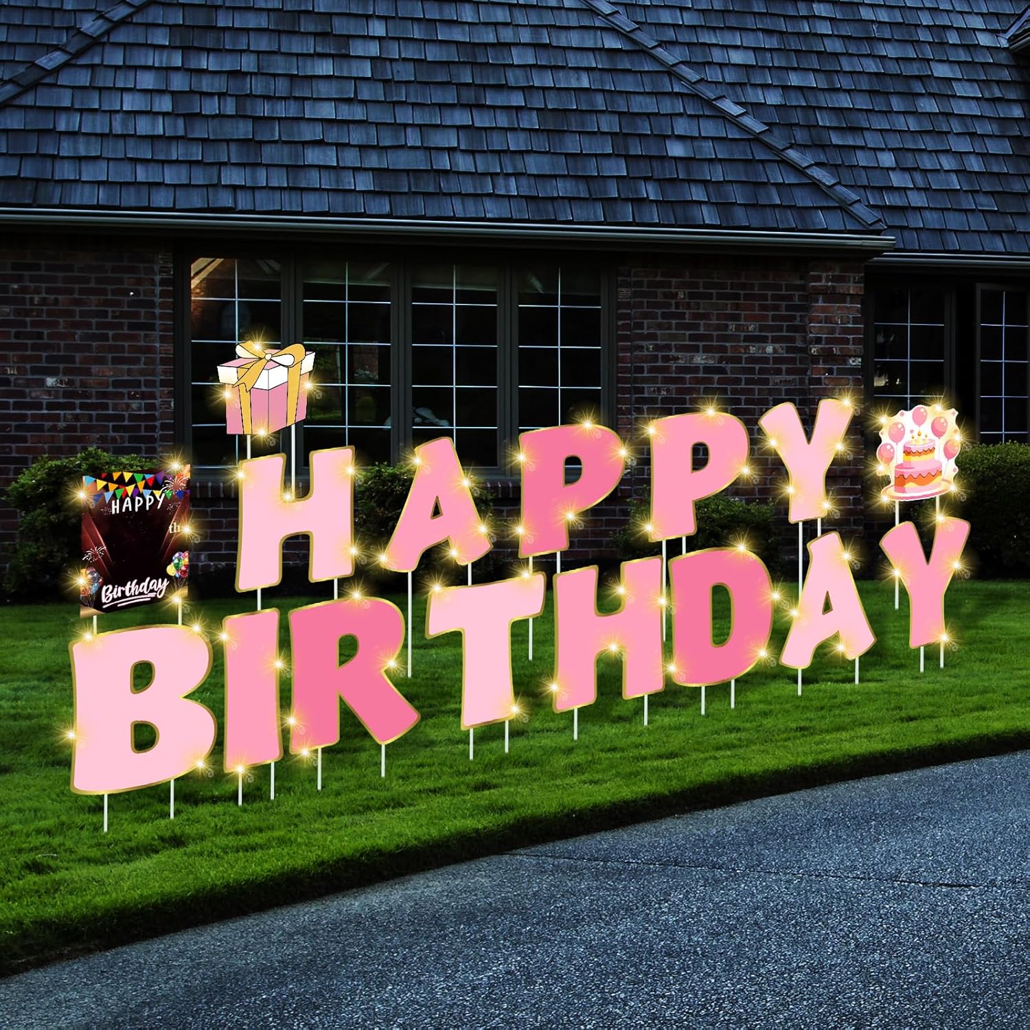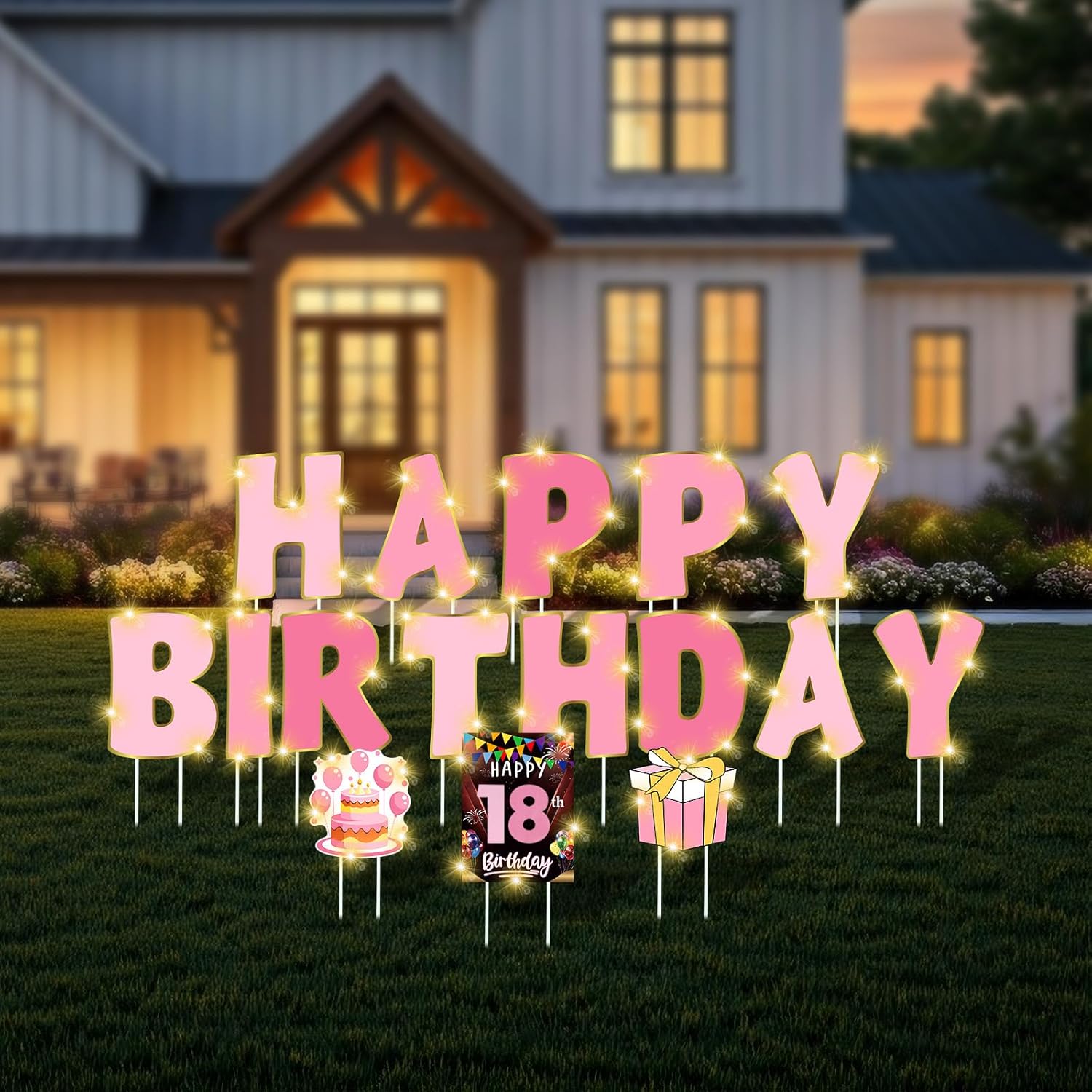 Features: 32 Plastic stakes are sturdy enough to be inserted into any type of ground. Just place two stakes into the flutes of each birthday sign. Our birthday yard signs with stakes will bring your birthday celebration bright and colorful. The print is easy to read even from a long distance. And stand out in the yards no matter what the weather is. Specifications: Material: polypropylene Color: gradient pink Size: Happy birthday yard sign: about 25.5 x 34 cm/10 x 13.4 inches Personalized age sign: about 25.5 x 34 cm/10 x 13.4 inches Birthday cake sign: about 23 x 25 cm/9 x 9.8 inches Gift box sign: about 25 x 23.5 cm/9.8 x 9.25 inches LED string lights: about 3 meter/ 9.84 ft in Length(Battery not included) Package includes: 13 x Happy birthday letters 1 x Personalized age sign 1 x Birthday cake sign 1 x Gift box sign 32 x Stakes 30 x Number stickers 3 x LED string lights(Battery not included) Notes: Manual measurement, please allow slight errors on size. The color may exist a slight difference due to different screen displays.