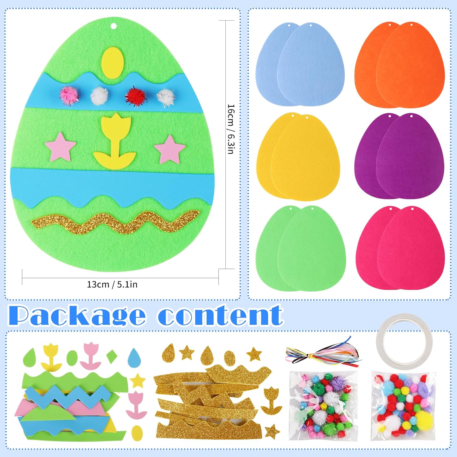 Pack of 12 Easter crafts children, Easter eggs craft set with felt and self-adhesive foam rubber parts, Easter pendant decoration for Easter, spring and children's Easter gifts. Features: Our Easter craft set for children is made of high-quality, odourless felt and EVA foam, completely harmless. It contains a wide range of accessories for DIY crafts, egg stencils, self-adhesive colourful foam rubber parts, soft plush balls. These craft materials provide vibrant colours, awaken children's attention and bring joy to children. Self-adhesive design, easy to use, children can craft completely independently. Our Easter craft sets are suitable for wonderful decoration, Easter party decoration, gift idea for friends and family. Material: felt and foam rubber and EVA. Size (L x W): Egg stencils: approx. 16 cm*13 cm Package includes: 12 x egg stencils (2 x yellow, 2 x purple, 2 x green, 2 x blue, 2 x rose red, 2 x orange). 100 x Easter egg EVA accessories. 12 x ribbons. 2 bags x plush balls. Note: This Easter craft set is suitable for children aged 3 and over. Do not swallow accessories.