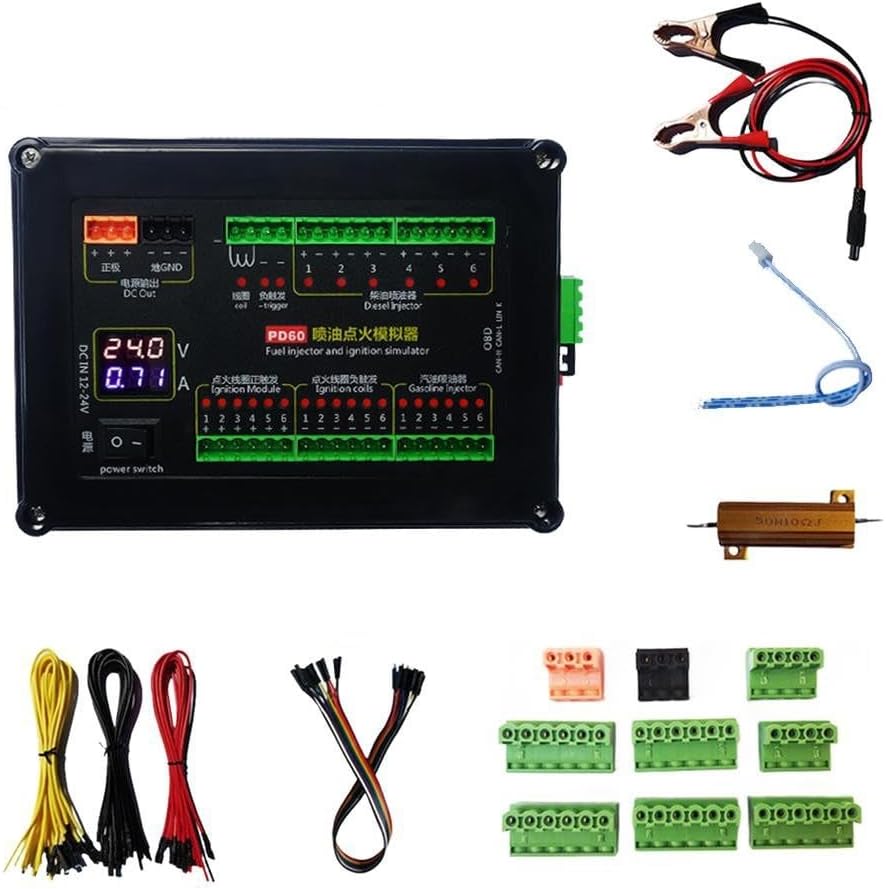 Features:PD60 fuel injection ignition simulator is a comprehensive car computer maintenance and testing tool. It can not only simulate and diesel fuel injectors, but also simulate ignition coils, which is very suitable for car computer maintenance and testing. It is a very practical car computer maintenance and testing tool that can significantly improve the efficiency of car repair shops.Injector simulation function: supports 12-24V electromagnetic diesel injector simulation and 12V injector simulationIgnition coil simulation function: supports positive trigger ignition coil simulation and negative trigger ignition coil simulation.Display function: built-in real-time display computer module, with voltmeter and ammeter functions, real-time monitoring of voltage and current during fuel injection and ignition, helping maintenance personnel to judge problems more accurately.Rich functions: with overcurrent for protection circuit, with on-board diagnostic socket, with high-power resistor (for fuel metering valve simulation), with 120Ω terminal resistor.With CAN data acquisition socket: PD60 is equipped with CAN analyzer socket and connecting wire, which can easily collect, analyze, store and replay CAN bus data (messages), which is very convenient to use.Note: This product does not have a signal generator and cannot simulate sensor signals.This instrument cannot simulate sensor signals such as crankshaft, camshaft, temperature, pressure, throttle position, accelerator pedal, etc.Specifications:Part name: PD60 ignition simulatorMaterial: absSize: 180*130*45.5mmColor: blackPackage content:1 * Ignition simulator1 * Power cord1 * High power resistor1 * CAN cable3 * Computer connection cable1 * Flat cable9 * WiringUsage tips:1. The instrument needs an external 12-24V power supply to work properly.2. The resistance of the diesel injector coil is very small, generally 0.3-0.5Ω.3. PD60 can simulate 12V-24V electromagnetic diesel injectors, but cannot simulate piezoelectric for crystal injectors.4. The instrument has overcurrent for protection inside. If the power output is short-circuited or the current is too large, the instrument will automatically power off.5. PD60 is a special device for auto repair technicians. Non-professionals should use it under the guidance of auto repair technicians.Note:For the computer to work properly, it is also necessary to input sensor signals such as crankshaft, camshaft,accelerator pedal, rail pressure, oil pressure, etc.!PD60 does not have sensor signal simulation function!This product does not include a signal generator and cannot simulate sensor signals.