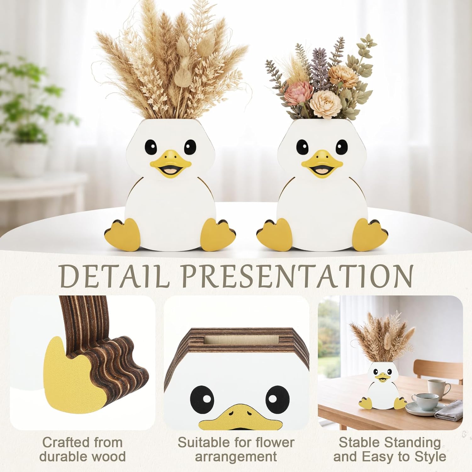Features: Adorable duck silhouette design, adds a vintage-inspired touch to desks, shelves, and party tables. Ideal for creating a cozy, cute atmosphere in dorm rooms, nurseries. Ideal for displaying dried flowers, faux greenery, or mini bouquets. The stable flat base ensures secure placement, while the clean white finish complements modern, retro, and interiors. Specifications: Material: wood Color: white, yellow Size: 6 x 5.5 x 1.2 inches/ 15 x 14 x 3 cm Package includes: 6 Notes: Manual measurement, please allow slight errors on size. The color may exist a slight difference due to different screen displays
