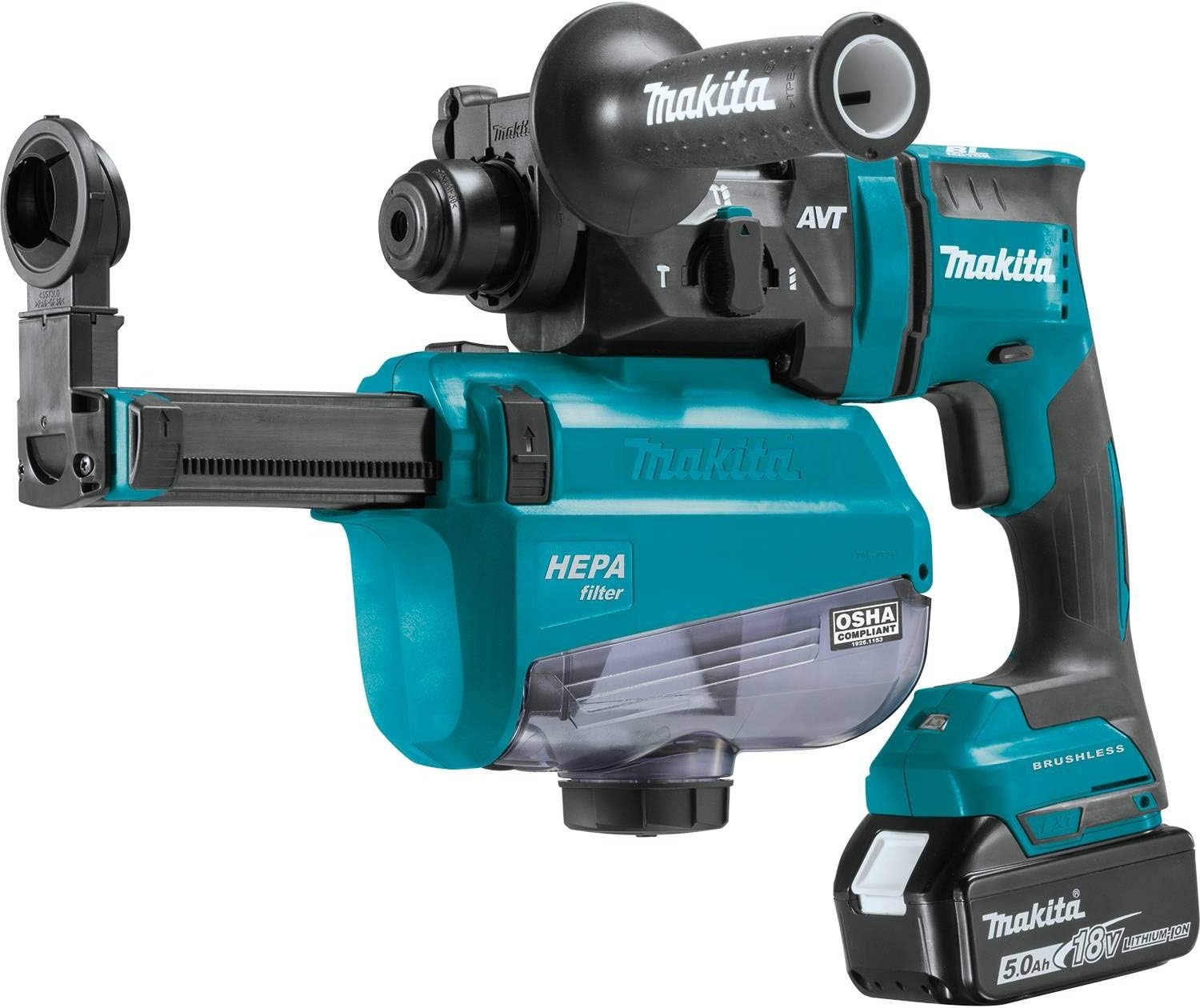 | Included Components | (2) 18V LXT® Lithium-Ion 5.0Ah Battery (BL1850B), 18V LXT® Brushless 11/16" AVT® Rotary Hammer, AWS™ Capable (XRH12Z), 18V LXT® Lithium-Ion Rapid Optimum Charger (DC18RC), Depth Gauge, Dust Case with HEPA Filter Cleaning Mechanism (199588-6), Dust Extractor Attachment with HEPA Filter Cleaning Mechanism (DX05), Sealing Cap (424474-5), Side Handle, Tool Bag |