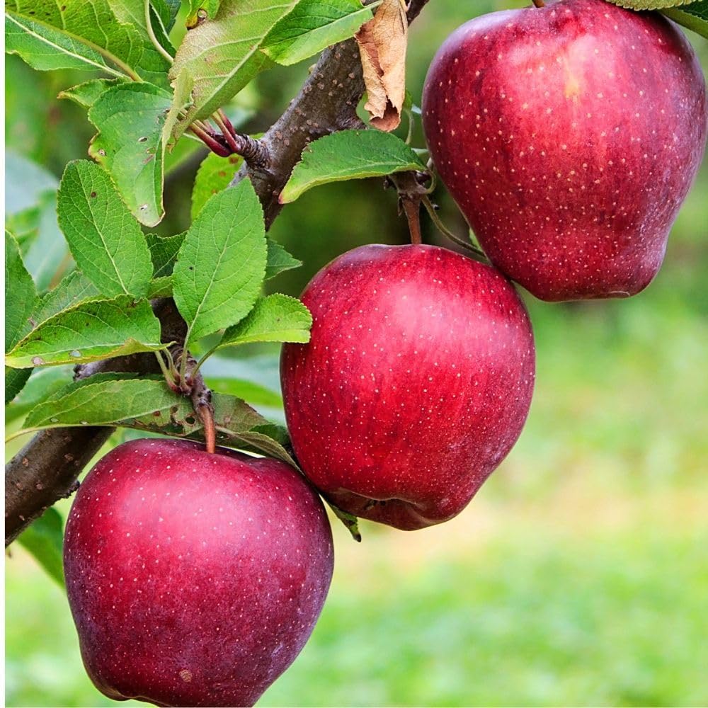 Red Delicious Apple trees ripen through September and October and produce large, dark red fruit. The apples' sweet and juicy taste is perfect for the family apple pie recipe and other dessert cooking. The tree requires 900 chill hours, and Golden Delicious Apple trees are the recommended pollinators for this tree. For planting, apple trees prefer full sun and moist, well-drained soil. At maturity, the Red Delicious can reach a height and width of 12-15 feet. USDA ZONES: Zone 4, Zone 5, Zone 6, Zone 7, Zone 8.